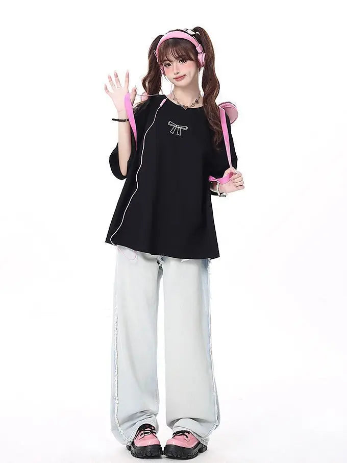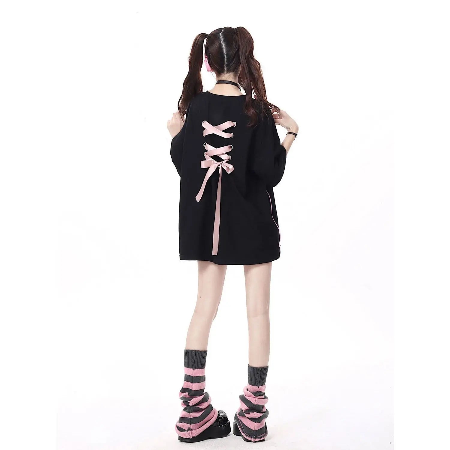 Bluza Jirai Kei ze Sznurowaniem na Plecach i Różową Wstążką Czarna