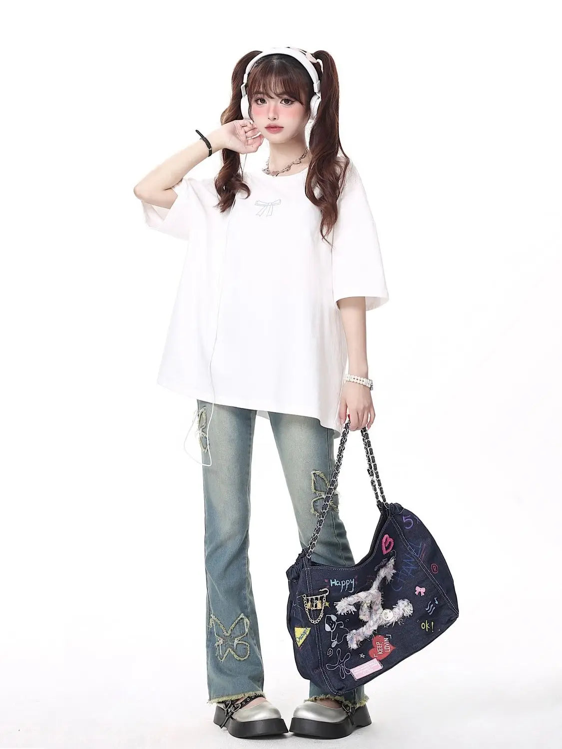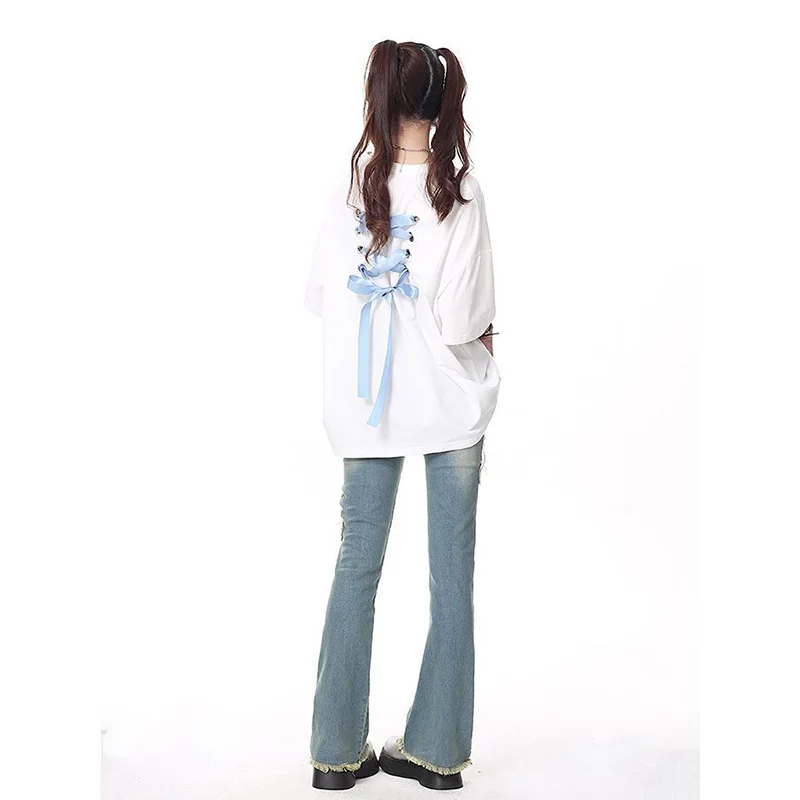 Bluza Rock ze Sznurowaniem na Plecach i Niebieską Kokardą Biała