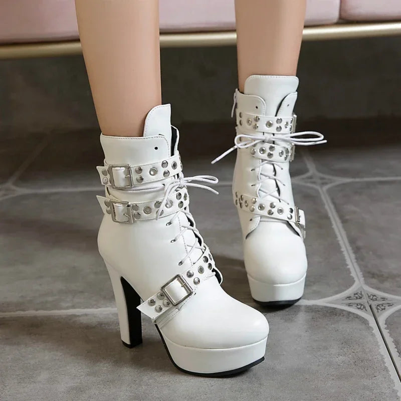 Wysokie Czarne Botki na Obcasie z Klamrami – Styl Cyberpunk biały