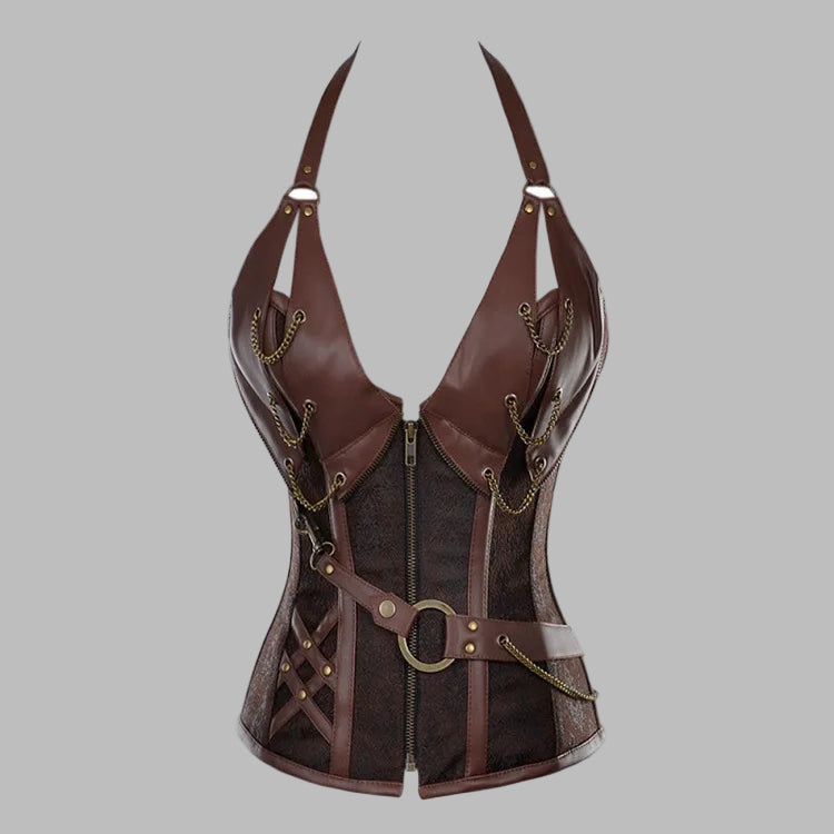 Brązowy Gorset Steampunk z Łańcuchami i Skórzanymi Paskami Zobacz opcje