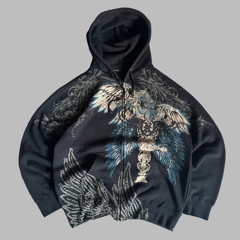 Czarna Bluza Metal z Nadrukiem Skrzydeł i Czaszek Zobacz opcje