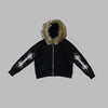 Czarna Kurtka Punk z Futrzanym Kapturem i Metalowymi Wzorami Zobacz opcje