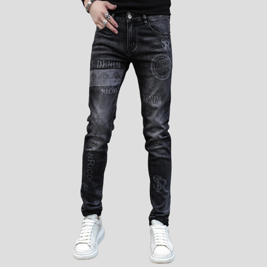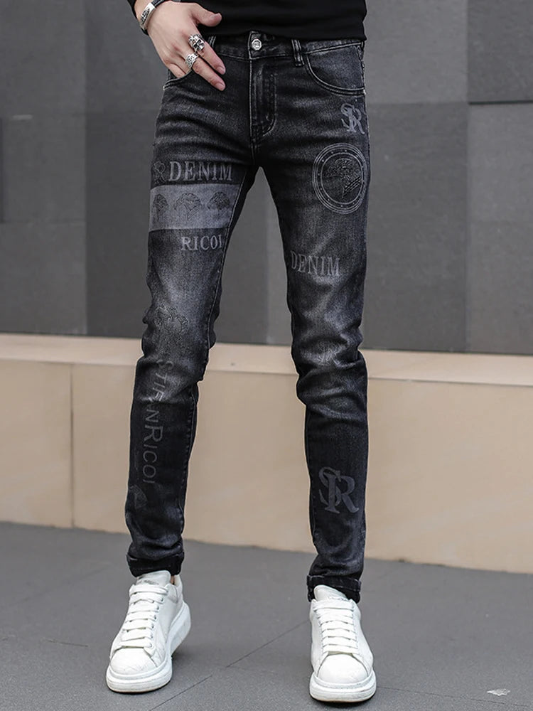 Czarne Jeansy Slim Rock z Napisami i Graficznymi Wzorami