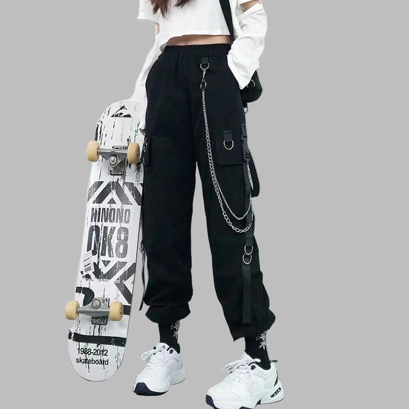 Czarne Spodnie Gotyckie Punk z Łańcuchami Kieszeniami Cargo Metal
