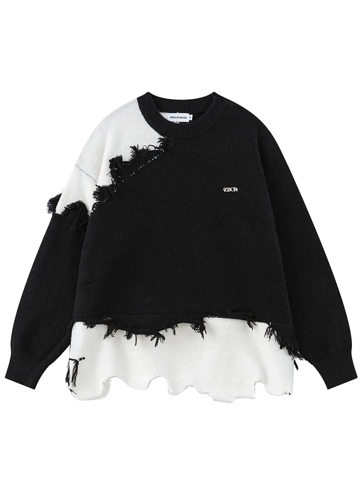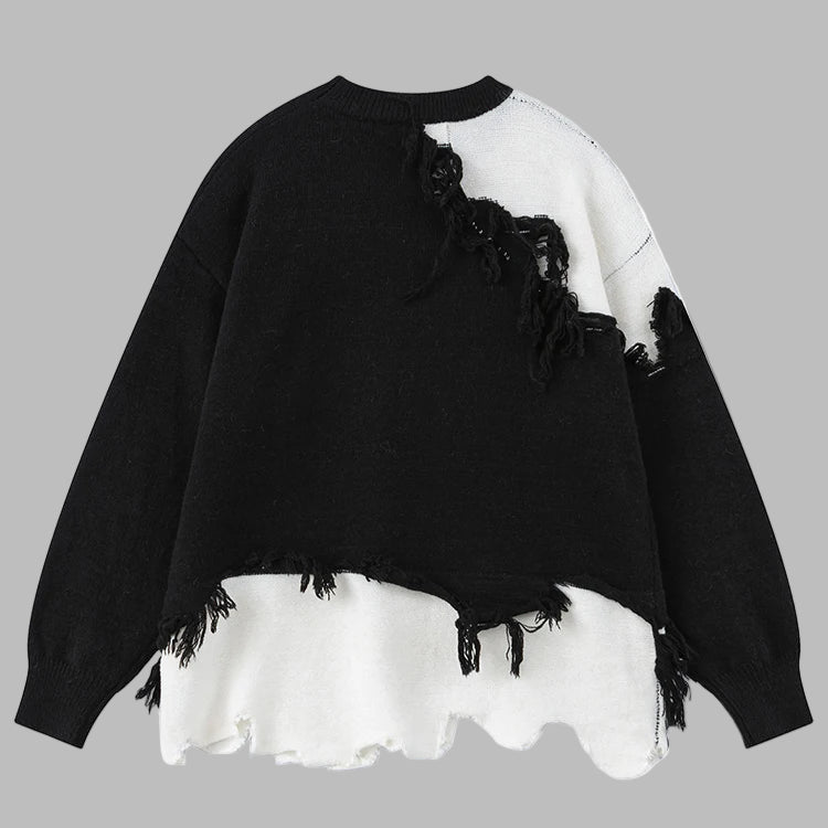 Czarno-Biały Sweter Punk z Przetarciami i Frędzlami