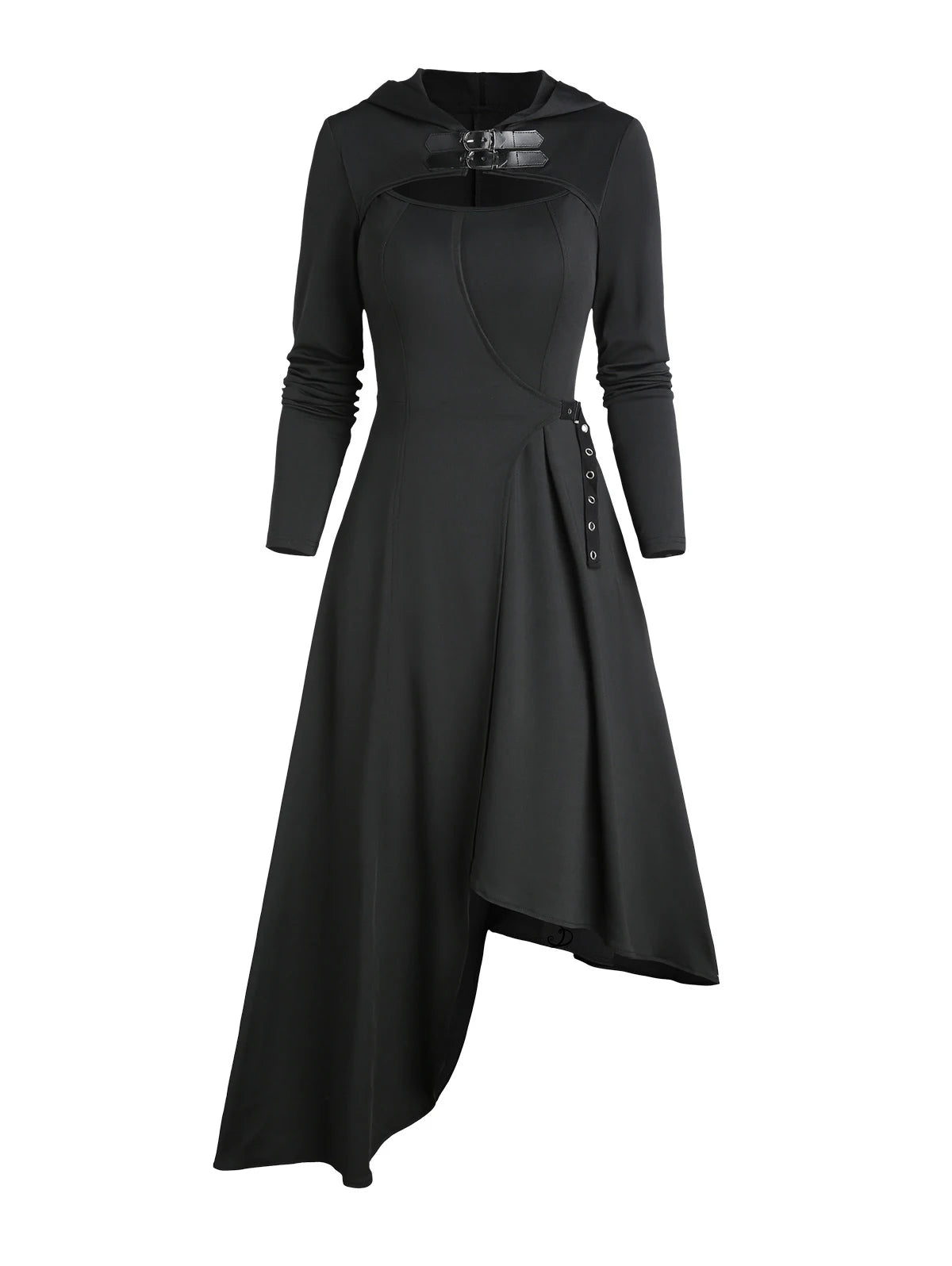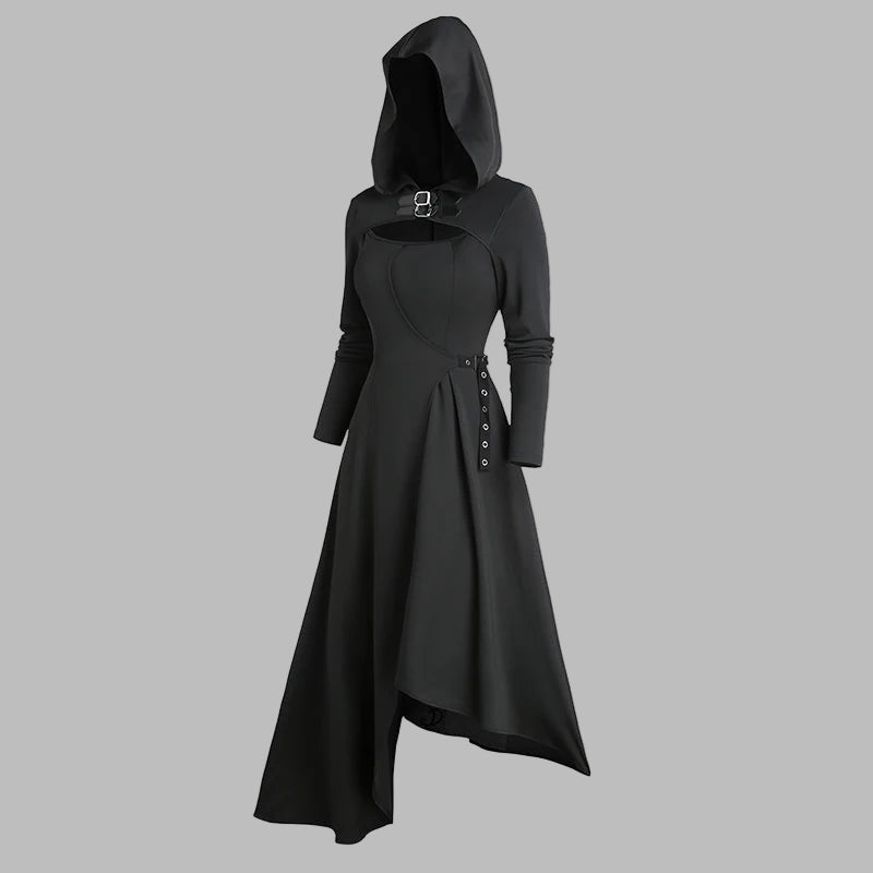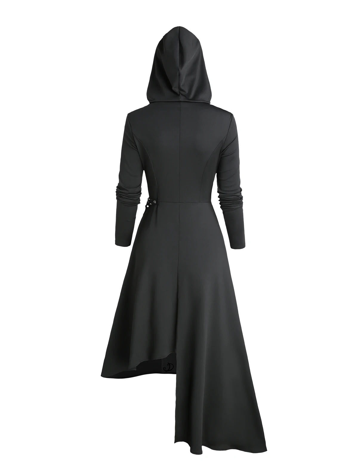 Czarny długi płaszcz z kapturem i paskiem asymetryczny