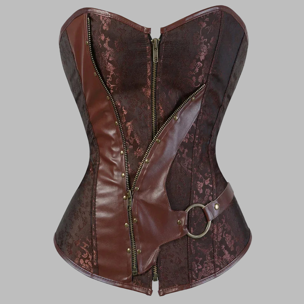 Gorset steampunkowy brązowy brokatowy z zamkiem i paskiem na pierścień Zobacz opcje