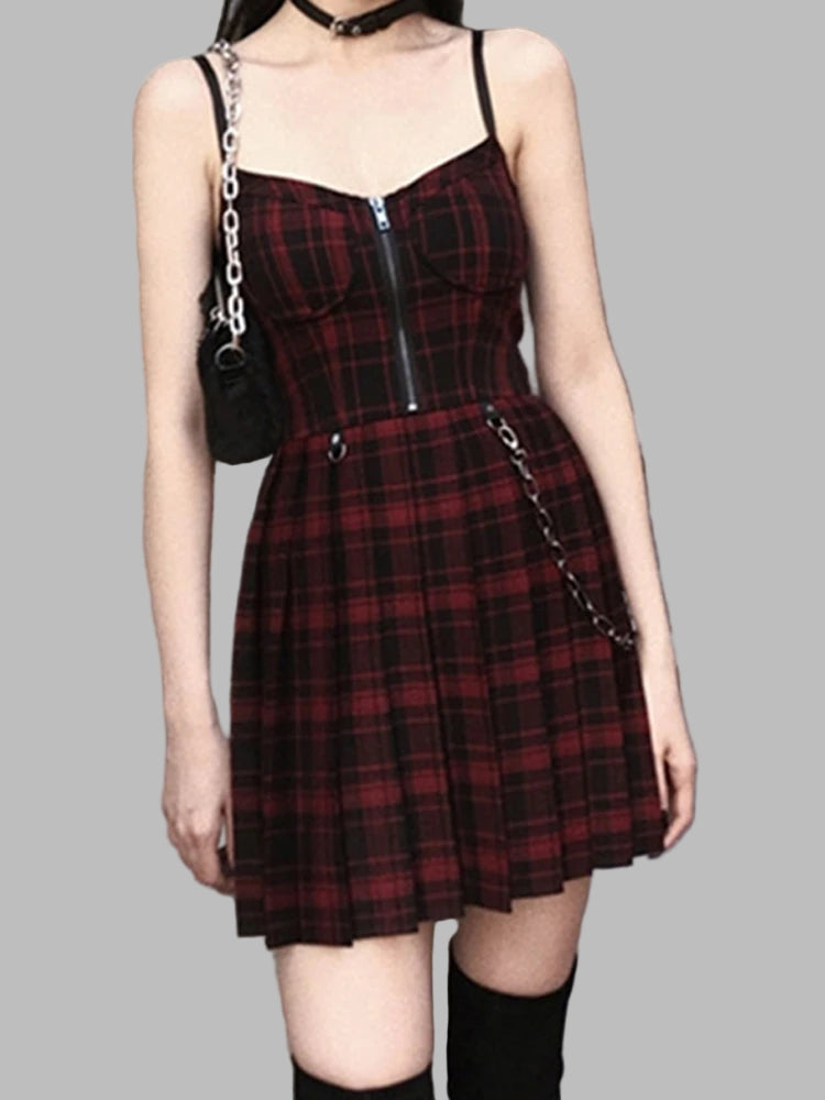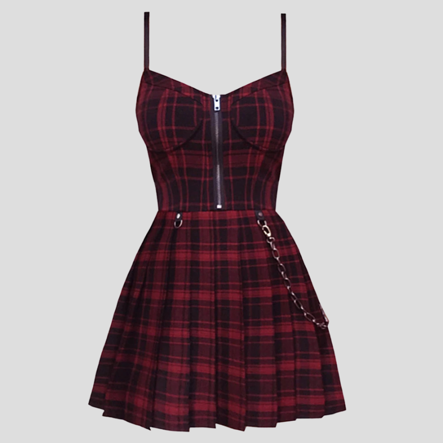 Grunge Punk Sukienka Bordowa w Kratę z Łańcuchem Zobacz opcje