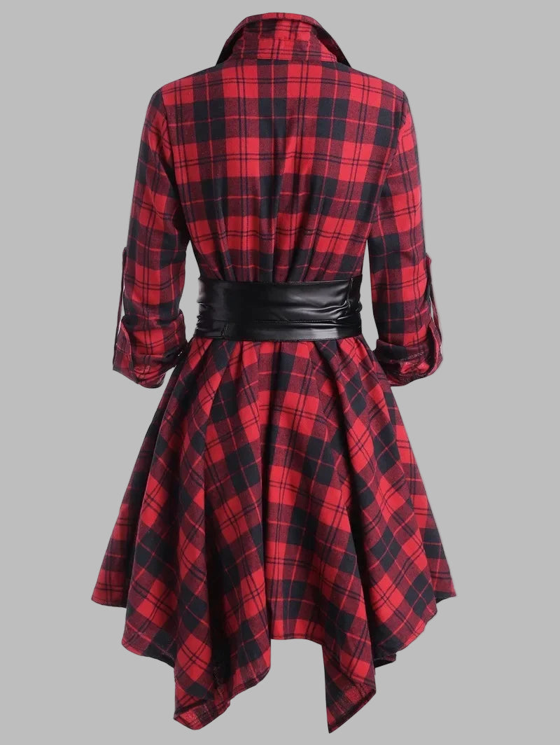 Grunge Punk Sukienka Koszulowa w Kratę z Czarnym Pasem XXL