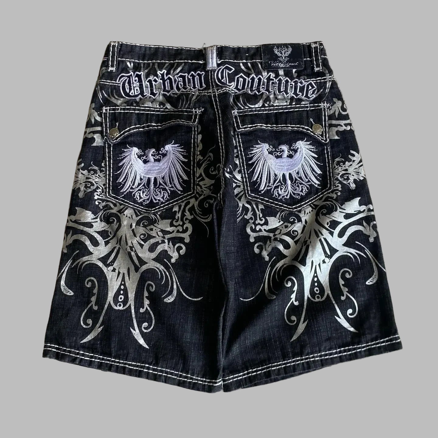 Grunge Spodenki Jeansowe Metal z Orłami i Wzorami Tribalnymi