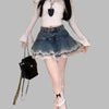Jeansowa Spódniczka Jirai Kei z Białą Koronką i Falbankami