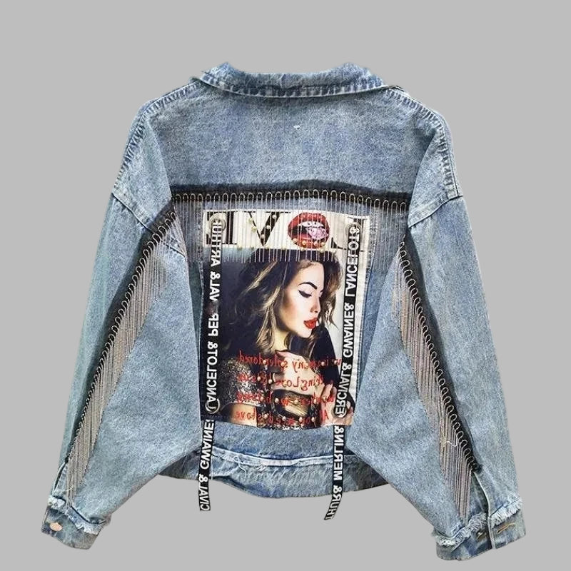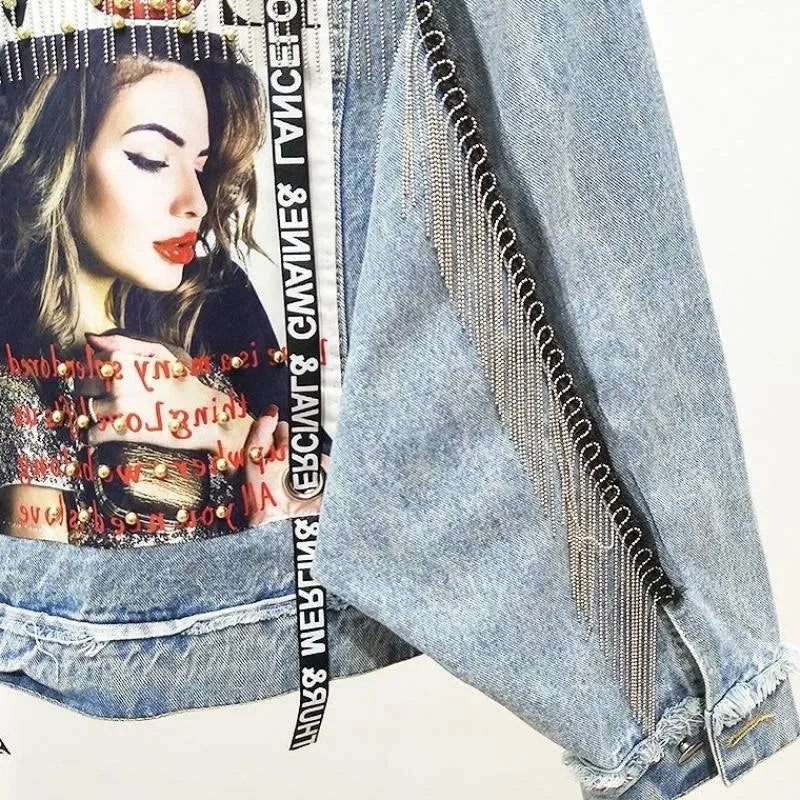 Kurtka Punk Grunge Jeansowa Nadruk Oversize Długi Rękaw