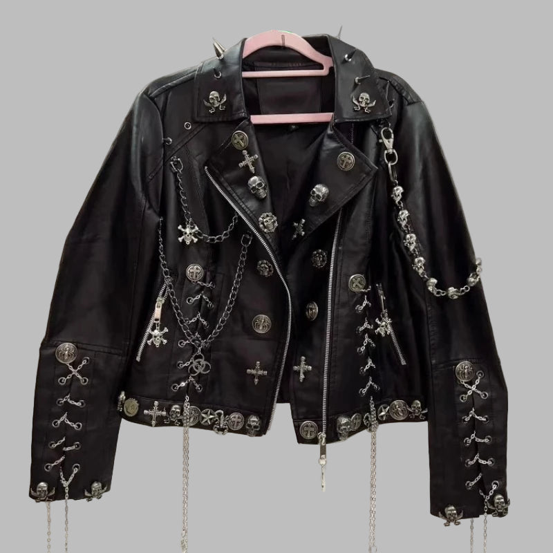 Kurtka Skórzana Gotycka Czarna Ćwieki Łańcuchy Krzyże Damska