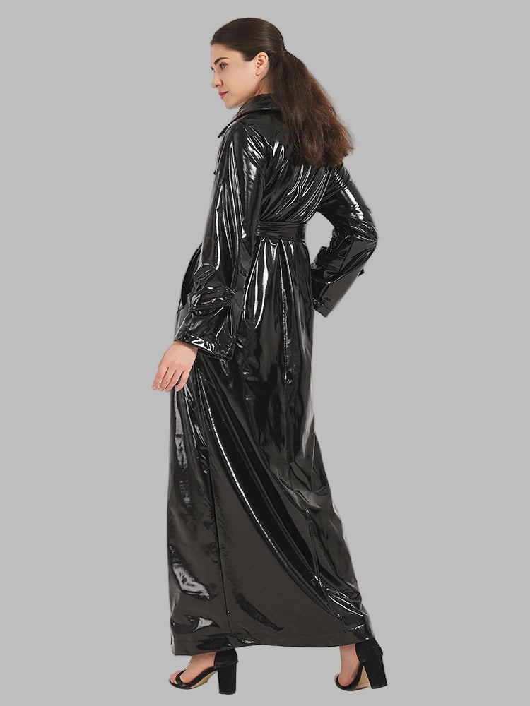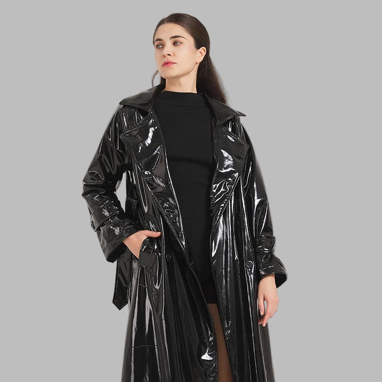 Płaszcz Skórzany Czarny Długi Damski Lakierowany Goth