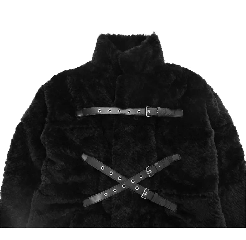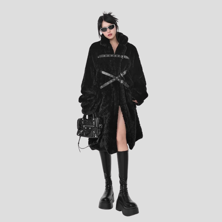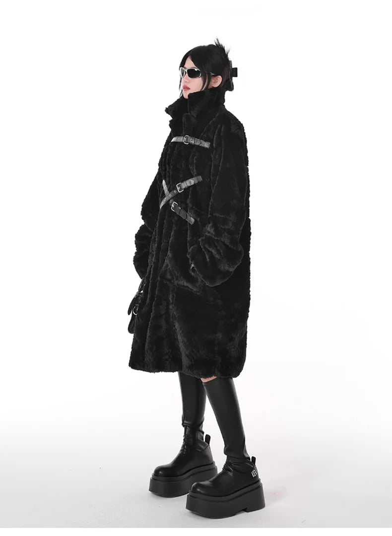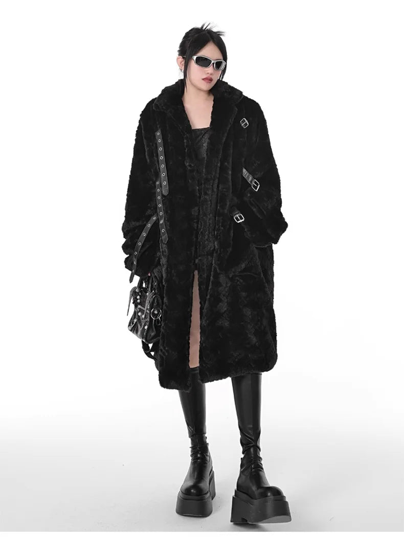 Punk Metal Płaszcz Czarny z Pasami Długi Futerko