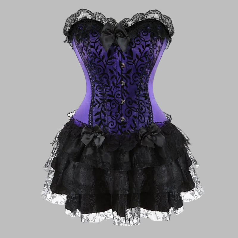 Punk Rock Gorset Fioletowy z Koronką i Czarną Spódniczką
