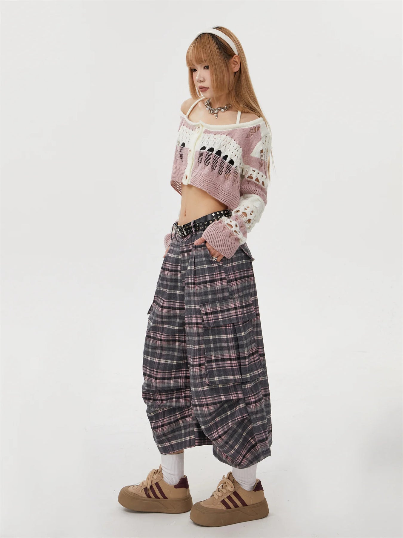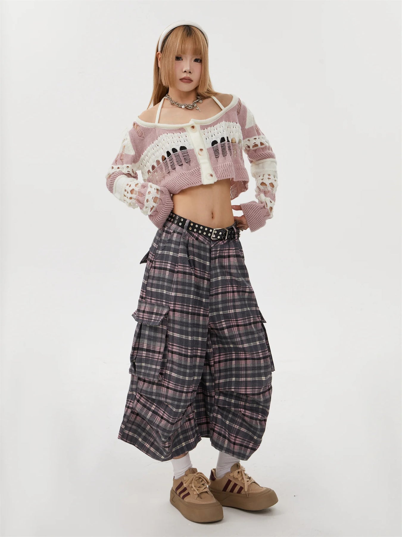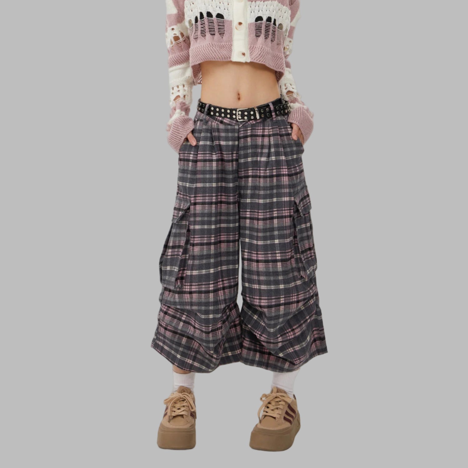 Punk Rock Spodnie w Kratę z Koronką Szaro-Różowe Zobacz opcje