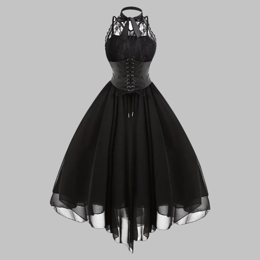 Czarna sukienka wiktoriańska bez rękawów z koronką i tiulem