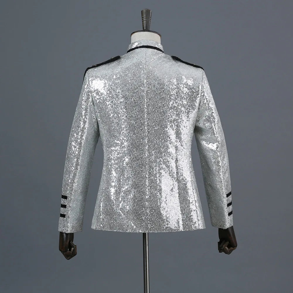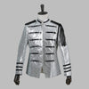 Rock Marynarka Cekinowa Srebrna z Czarnymi Frędzlami Militarna