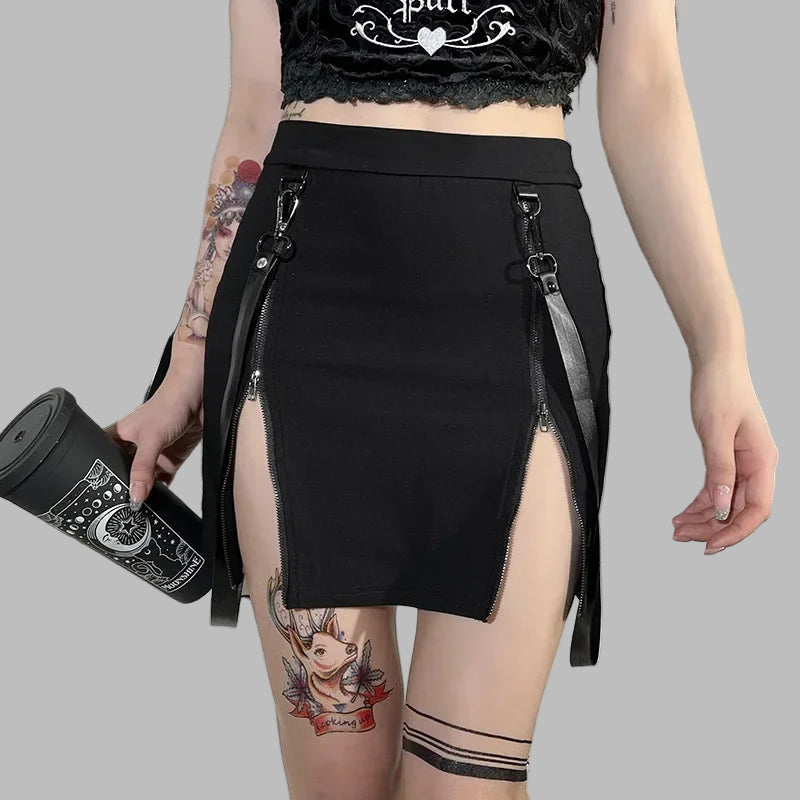 Spódnica gotycka czarna mini z zamkami i paskami straps