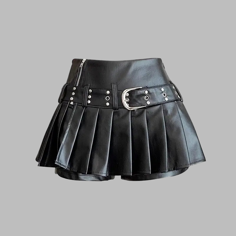 Spódnica Mini Czarna Skórzana Plisowana Pasek Metalowa
