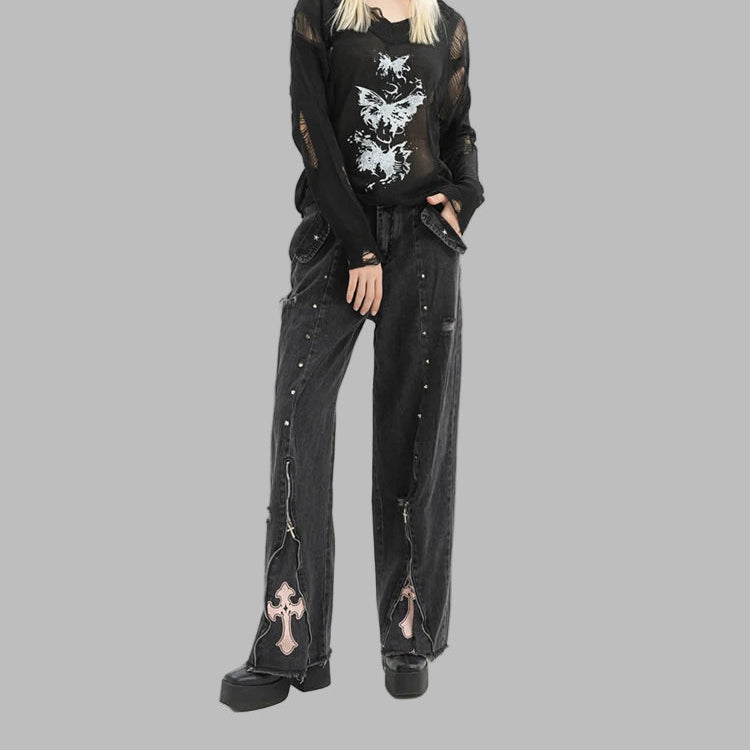 Spodnie Gotyckie Punk Denim Krzyże Nity Szerokie