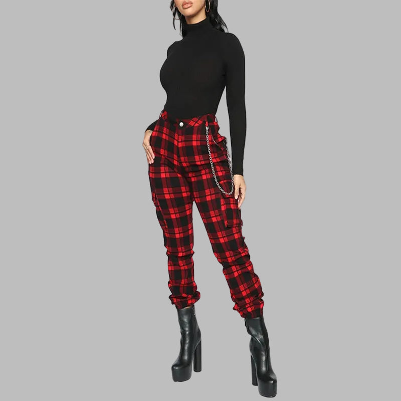 Spodnie Punkowe Kratka Czerwona Czarna Łańcuch Dopasowane