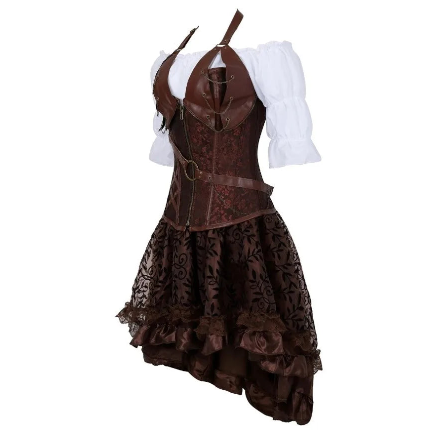 Steampunk Sukienka Brązowa z Gorsetem i Białymi Rękawami Zobacz opcje