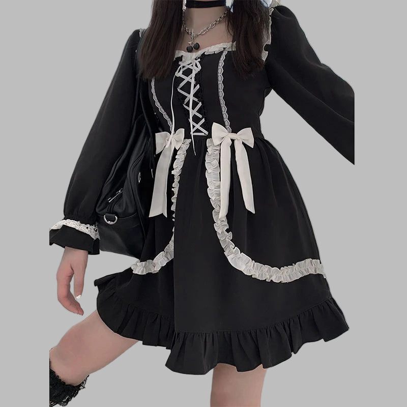 Sukienka Jirai Kei z Białymi Kokardami i Sznurowaniem Czarna