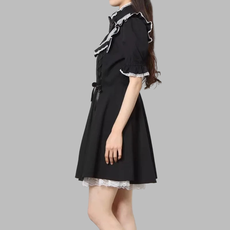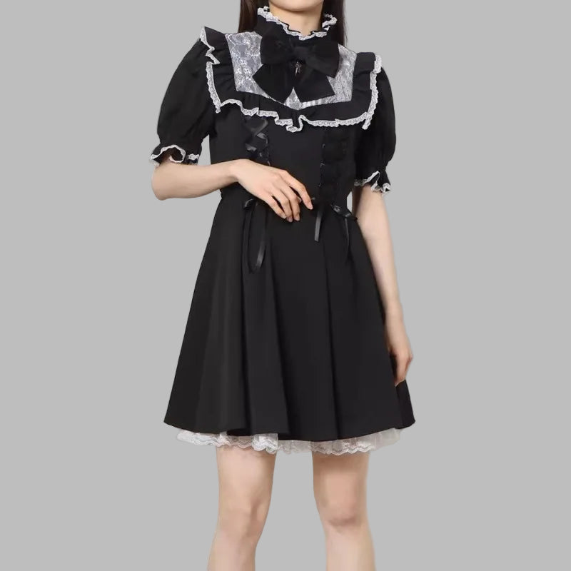 Sukienka Jirai Kei z Koronkową Kokardą i Sznurowaniem Czarna