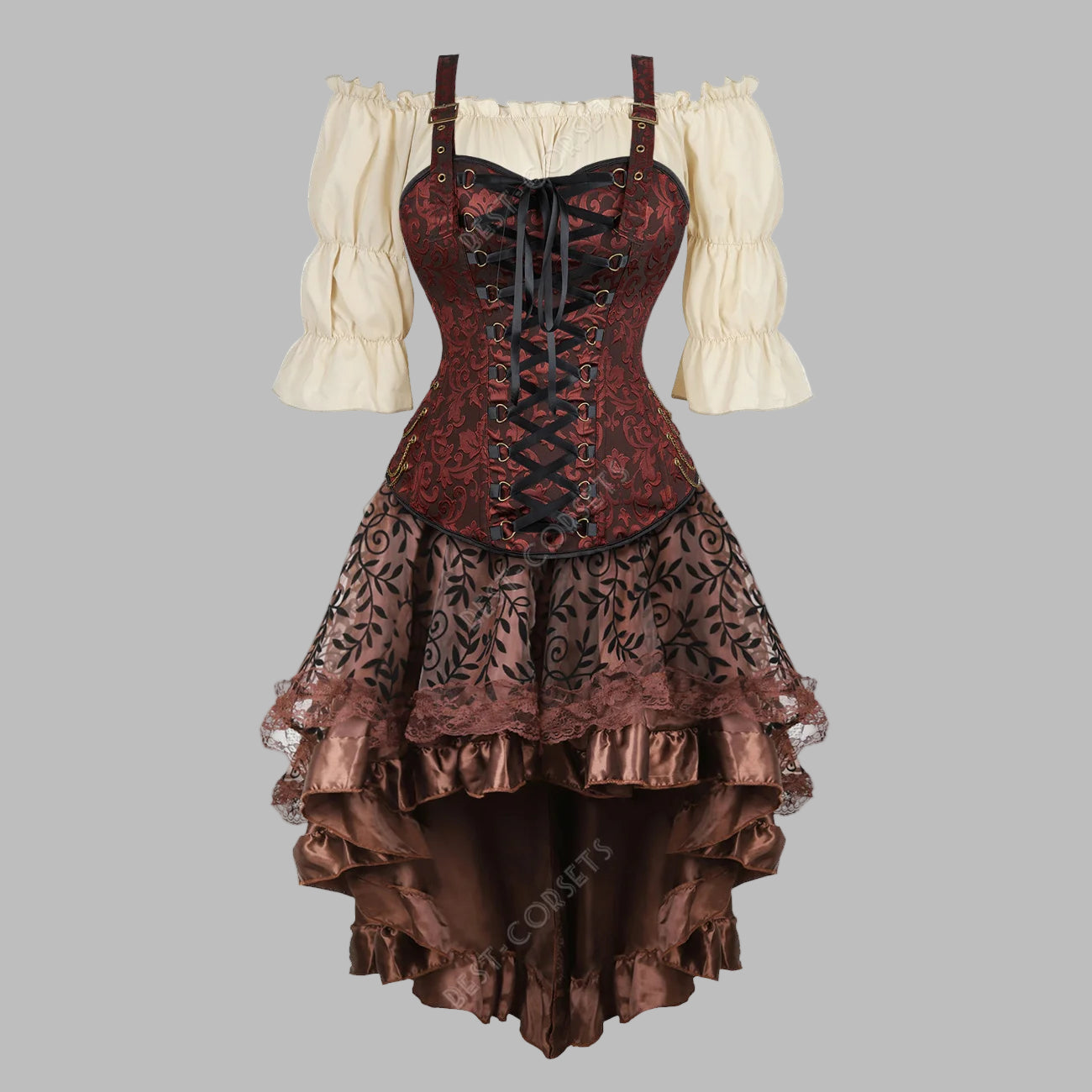 Sukienka Steampunk z Bordowym Sznurowanym Gorsetem i Koronką Zobacz opcje