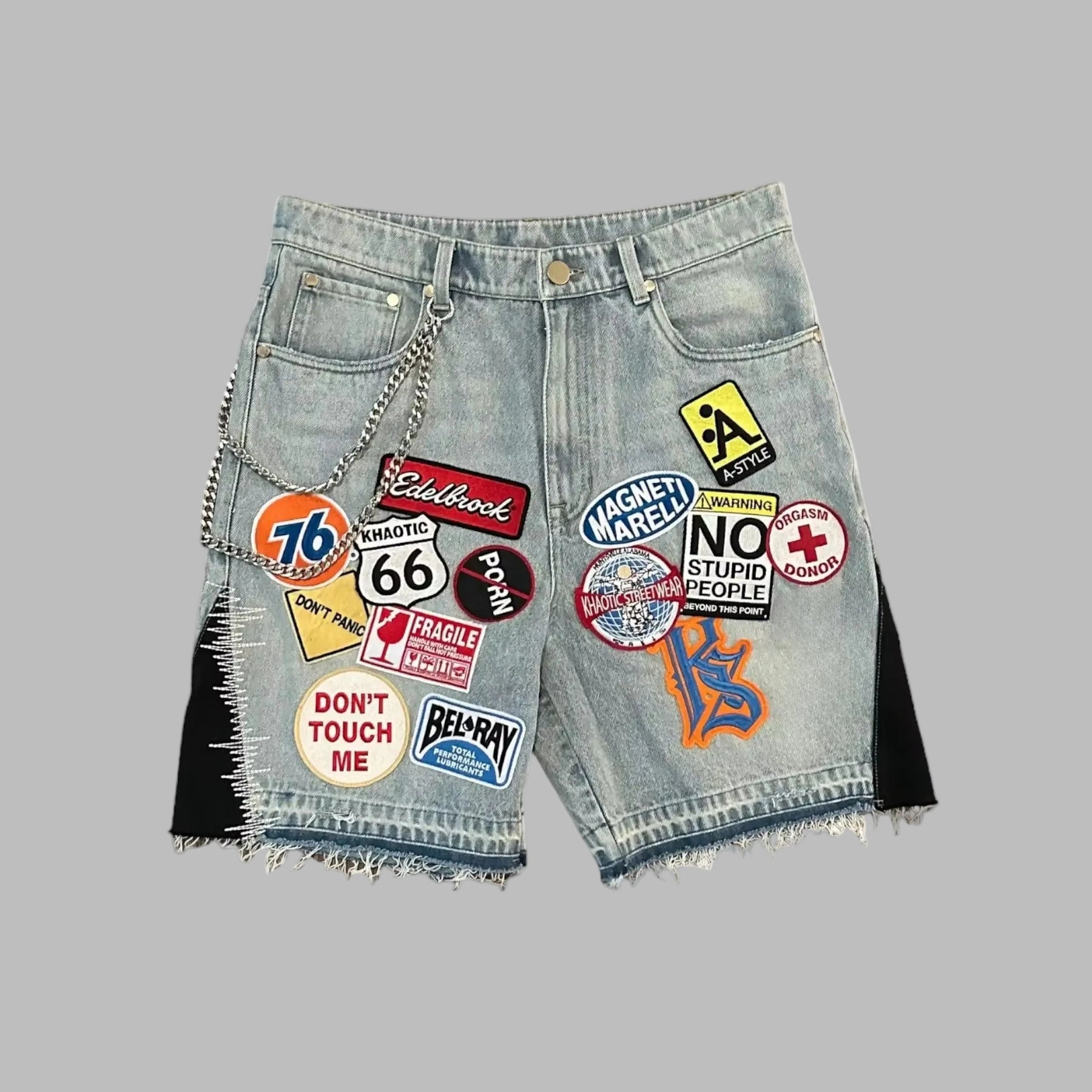 Szare Spodenki Jeansowe Rock z Kolorowymi Naszywkami i Łańcuchem XXL